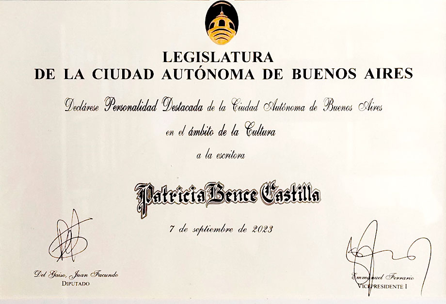 - 2023 -Personalidad Destacada en el ámbito de la Cultura. Otorgada por la Legislatura de la Ciudad de Buenos Aires. .